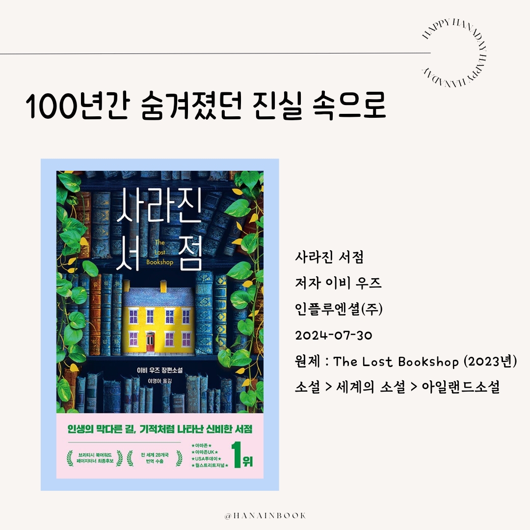 잃어버린 서점에서 결국 말하고자 하는 바도 여운 깊었고 스토리도 순탄하게 흘러가 기대 이상이었습니다.