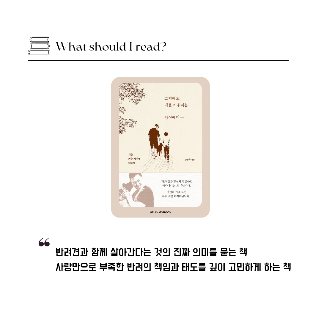 이 책은 단순히 반려견 양육서가 아닌 함께 살아가는 삶에 대한 깊은 고민을 다루고 있어 반려견과 함께할 준비가 되어 있는지, 더 나은 반려인이 되기 위해 어떤 노력을 해야 하는지에 대해 생각하게 합니다.