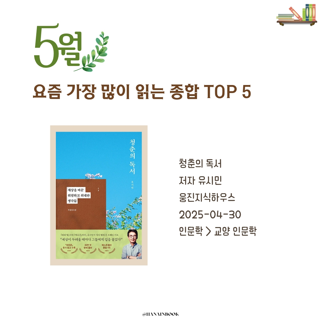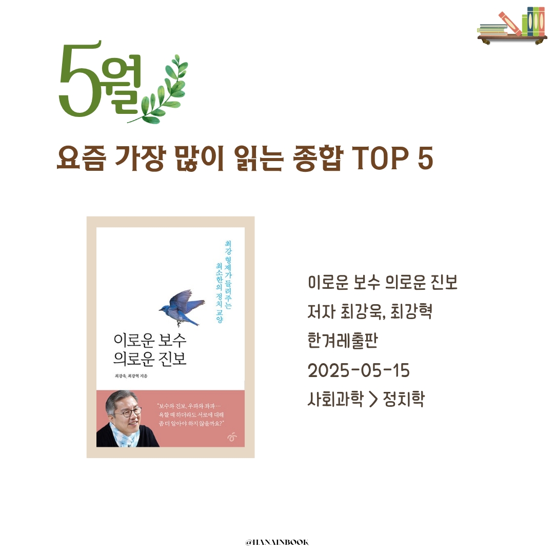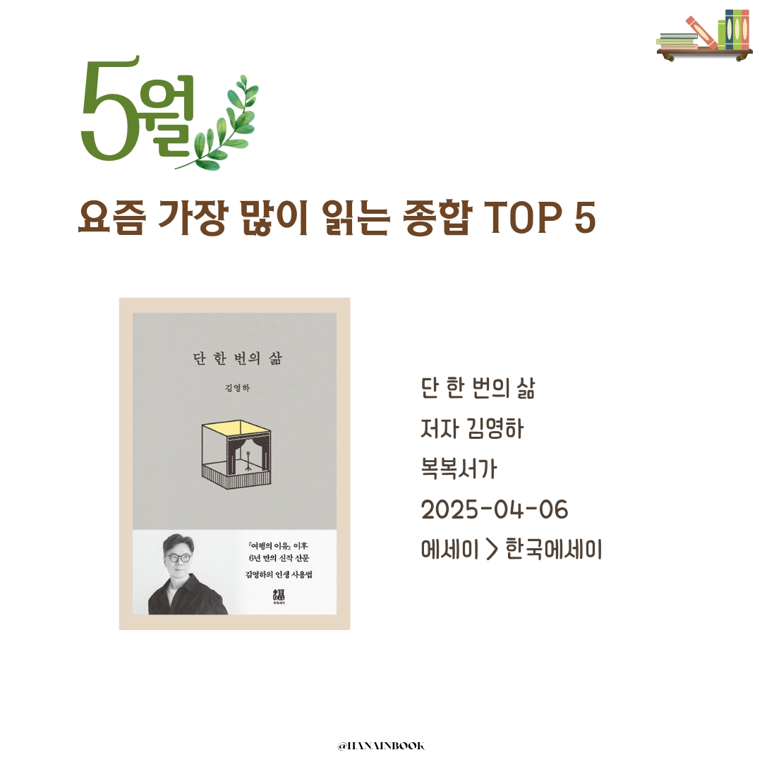 하나의책장이 전하는 매월 마지막 주 독서 트렌드, 2025년 5월, 독자들이 가장 많이 고른 책 5권을 소개합니다.