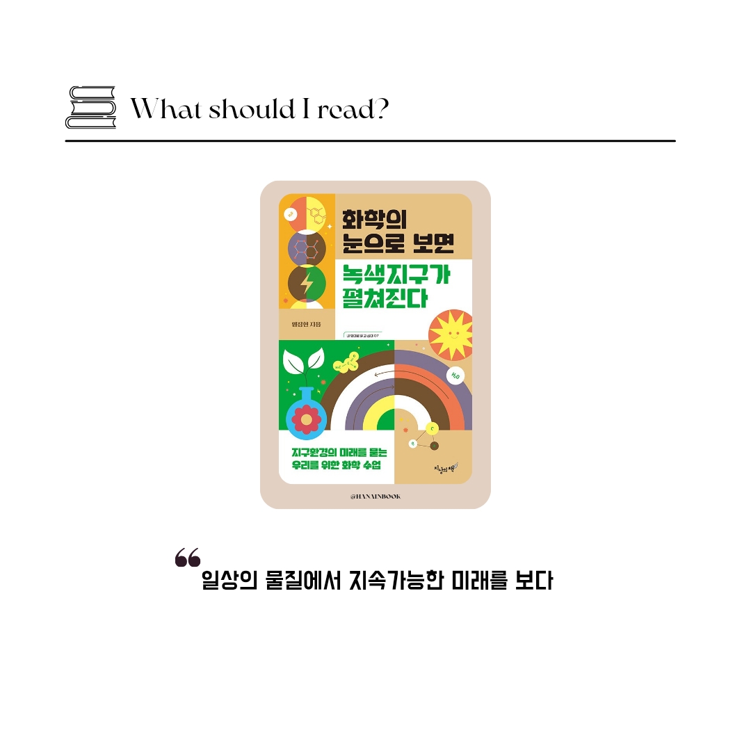 『화학의 눈으로 보면 녹색지구가 펼쳐진다』는 그 조용한 시작이 얼마나 의미 있는 변화로 이어질 수 있는지를 과학의 언어로, 따뜻한 시선으로 보여주는 책이었습니다.