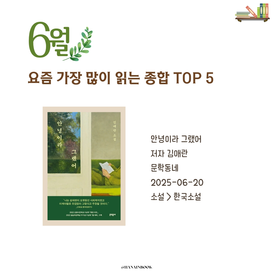 하나의책장이 전하는 월간 종합 베스트셀러, 2025년 6월 종합 순위 TOP 5를 소개합니다.