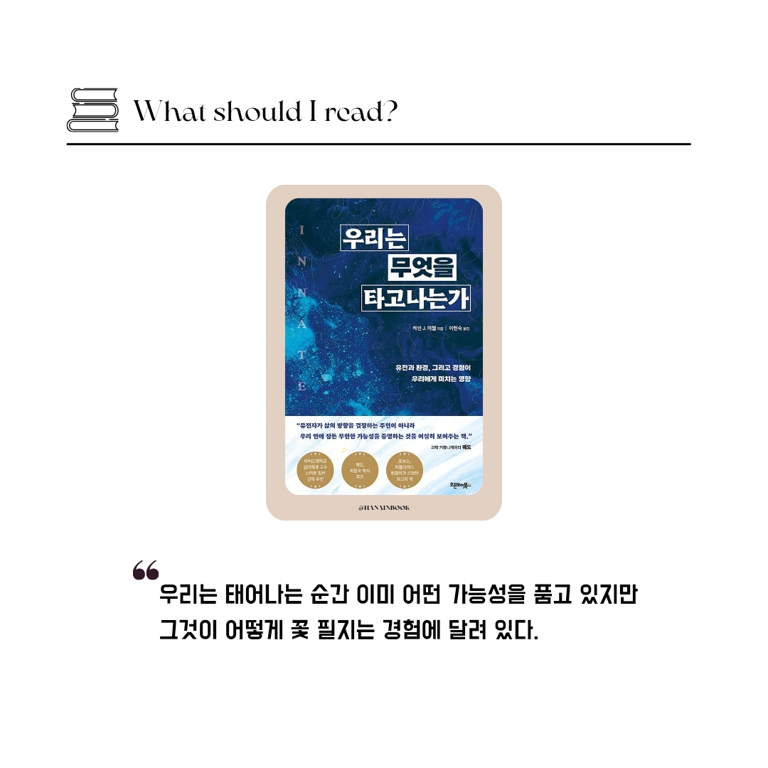 『우리는 무엇을 타고나는가』는 인간이 유전과 환경의 경계에서 어떻게 나로 완성되는지를 탐구하는 철학적 교양서입니다.