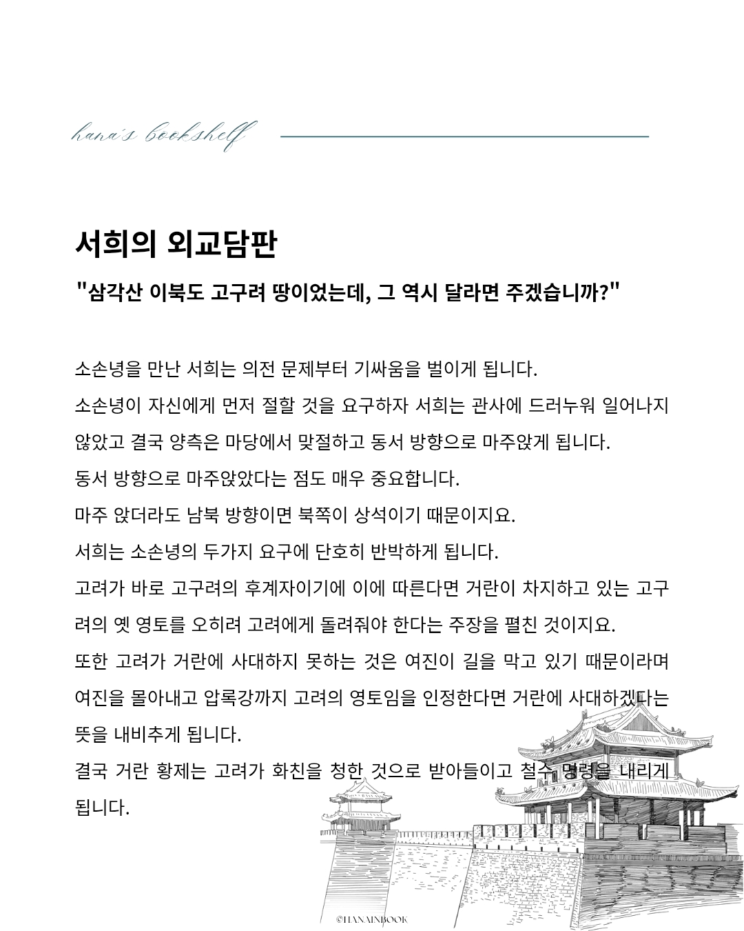 당시 고려는 거란과의 전쟁을 피한데다 북쪽으로 영토를 넓히는 성과까지 거두었으니 외교 핵심은 전쟁을 피하는데 있다는 것을 보여준 대표적인 사례이기도 합니다.