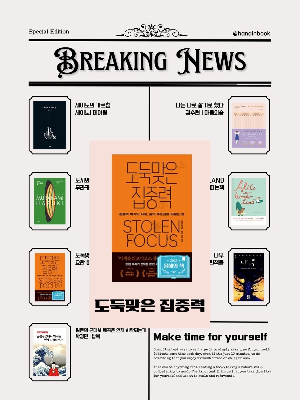 집중력이 떨어지고 있음을 느껴 도둑맞은 집중력을 되찾고자 책을 펼쳤다.